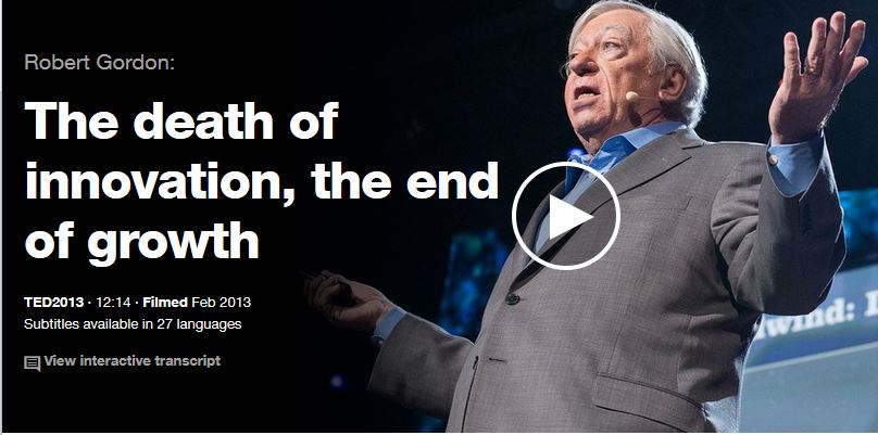 Voici une transcription d'une conférence faite par Robert Gordon à TED sous le titre "The death of innovation, the end of growth". Robert Gordon est professeur de macro-économie à la Western University 2. On trouve aussi sa thèse dans le débat sur la stagnation séculaire que j'ai publié sous le titre ""Stagnation séculaire, quesaco?" (dans les références item 6.5).