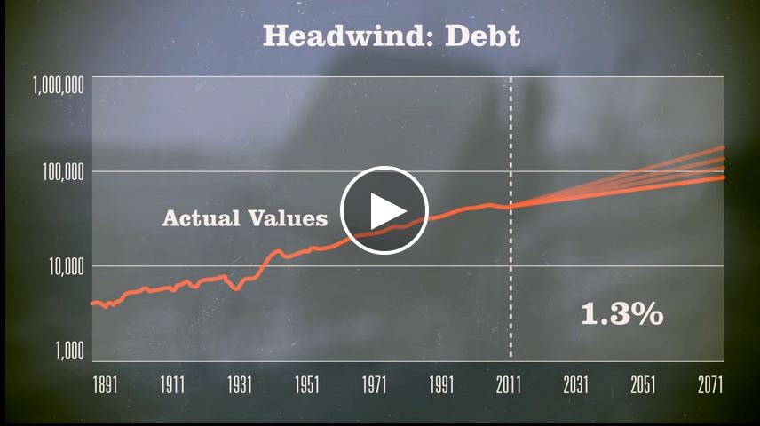 Maintenant nous allons passer à autre chose et observer le niveau de revenu par personne. L'axe vertical correspond ici à des milliers de dollars aux prix d'aujourd'hui. Vous remarquerez qu'en 1891, là sur la gauche, on était autour des 5000$. Aujourd'hui, on est environ à 44000$ de richesse totale par habitant. Qu'arriverait-il si nous pouvions atteindre cette croissance historique de 2% au cours des 70 prochaines années ? Eh bien, c'est de l'arithmétique. Une croissance de 2% quadruple le niveau de vie en 70 ans. Ce qui veut dire que nous passerions de 44000 à 180000$ (lien). Eh bien, ça n'arrivera pas, à cause des quatre vents-contraires que j'ai mentionnés.