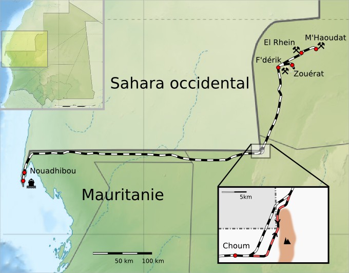 J'ai eu la chance de faire une mission aux mines de fer de Mauritanie pour la Banque Africaine de Développement avec mon collègue Claude Rougeot. Arrivés à Nouakchott par avion depuis Abidjan, nous avons rejoint Nouadhibou en voiture. De là nous avons embarqué sur le train de minerais repartant à vide vers Zérouate, à 700km de là. Partant de l'océan, la voie ferrée suit la frontière mauritanienne avec le Sahara occidental, d'ouest en est, jusqu'à Choum puis remonte vers le nord. Avant 1978, elle traversait la montagne Choum par un tunnel, mais celui-ci est maintenant fermé; le terrain est difficile la voie contourne ce passage en pénétrant sur 5 km dans le territoire du Sahara occidental (voir cette image source wikipedia commons)..