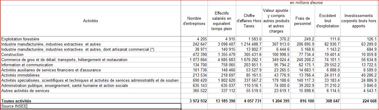 La France comptait en 2018 environ 4 millions d'entreprises de toutes tailles, employant 13 millions de personnes en équivalent temps plein ETP. Ces 4 millions d'entreprises ont réalisé un chiffre d'affaires hors taxes de 4000 milliards€, une valeur ajoutée de 1200 milliards € soit environ la moitié (50.1%) du PIB de 2018 de 2353 milliards €. L'autre moitié c'est l'État, fournisseurs de services publics indispensables pour faire fonctionner ce système mais aussi prédateur.