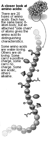 There are 20 amino acids available for stringing. Each has an identical eight-atom "body." Attached to the body is a tail -- in chemical parlance, a "side chain" -- that contains between one and 18 atoms, depending on which amino acid it is. Some side chains are short, others long. Some are linear, others circular. All contain hydrogen, most contain carbon, many contain oxygen, and a few contain nitrogen and sulfur.