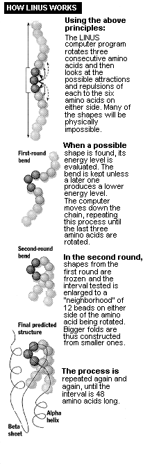 It takes the program four or five days of continuous computing to reach a final answer. LINUS predicts secondary conformation with 99 percent accuracy. The tertiary conformation was recognizable -- though not perfect -- in six of the seven proteins tried. (And the researchers think they know why the seventh one didn't work).