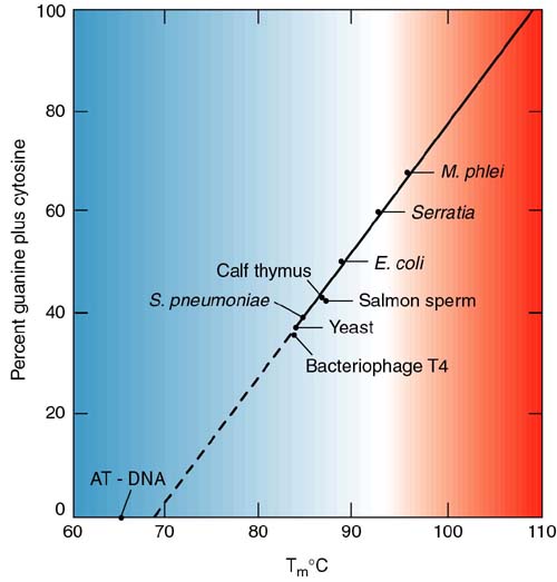 As I'm sure you remember, AT base pairs have two hydrogen bonds and GC pairs have three. Therefore, there is more energy in the GC bond. Consequently, the higher the GC content of a molecule, the higher the melting temperature (more energy is necessary to make the helix-coil transition).
