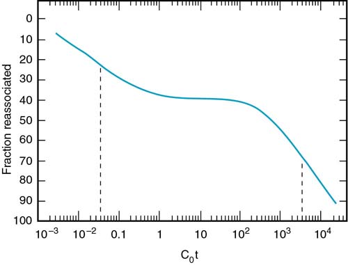 Eukaryotic DNA is much different than this simple picture. On the far right of the above figure you see calf DNA, the non-repetitive fraction. The total DNA has different populations of sequences. The Cot curve of total calf DNA is shown in Figure 2.21