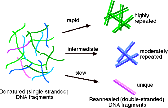 The highly repeated sequences (many copies per genome) will renature rapidly, since kinetically any strands can find a match much more quickly. The moderately repeated fraction will have an intermediate time of renaturation. Finally the unique sequence (e.g., calf non-repetitive fraction) will have the slowest time of renaturation.