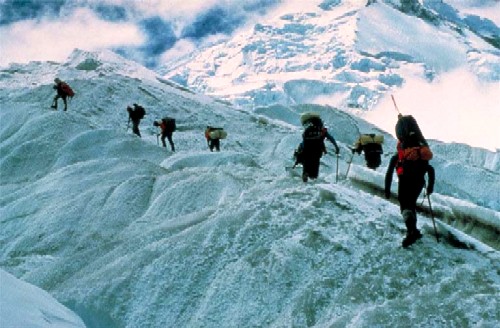 Ice drilling teams. Above, carrying equipment up Huascaran, Peru, the world's highest tropical mountain. Below, extracting a 6-meter core segment from the drilling apparatus in subzero temperatures at the GISP2 site in Greenland.