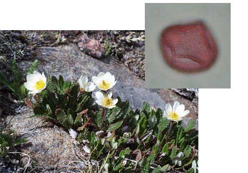 The tundra flower Dryas octopetala and (inset, enlarged) a grain of its pollen.
