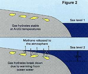 The largest source of natural gases, mostly composed of CH4 , is stored in gas-hydrates beneath permafrost and the onshore permafrost reservoir is roughly estimated to be as much as 32,000 Gt. (1Gt = 109 tons). This is 106, or one million, times as much as the CH4 released in the atmosphere of all northern ecosystems. Dr. Shakhova feels that a very small disturbance of gas hydrates could cause catastrophic consequences within a few decades. Shallow bottom sediment and underlying permafrost have warmed approximately 15°C since the time they originated. The implications of this trend are that shallow off-shore gas hydrate deposits could become vulnerable (Fig.2). She also notes that methane plumes found in the East-Siberian Sea (ESS) during the 1 st and 2nd Russian-U.S. joint cruises during September of 2003 and 2004 may indicate decaying gas hydrates in thawing undersea permafrost.