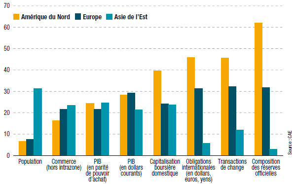 Mais cela ne durera pas éternellement, notent les auteurs d'un récent rapport du Conseil d'analyse économique. L'hégémonie du dollar n'est plus cohérente avec le déplacement du centre de gravité de l'économie mondiale. D'ici à dix ans, le poids économique de la Chine - mesuré par son PIB… en dollars - aura rejoint celui des Etats-Unis. Trois grands ensembles régionaux - l'Amérique du Nord, l'Europe et l'Asie de l'Est - devraient alors s'organiser chacun autour de trois grandes monnaies : le dollar, l'euro et le yuan.