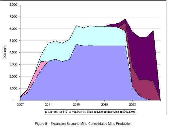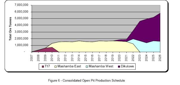 Contrats miniers : Kamoto sera complèment épuisé en 20 ans d'exploitation KCC 10 juillet 2006 - Un graphique extrait de l’étude de faisabilité de la joint venture KCC (Kamoto Copper Company) montre qu’après vingt années d’exploitation, les 5 mines de la Gécamines à Kamoto, T 17, Mashamba Est, Mashamba Ouest et à Dikuluwe qui totalisent 93.165.794 tonnes de réserves minérales identifiées (80 %) et probables (20 %) seront complètement épuisées par l'association avec Kinross Forrest Limited.Epuisement total de