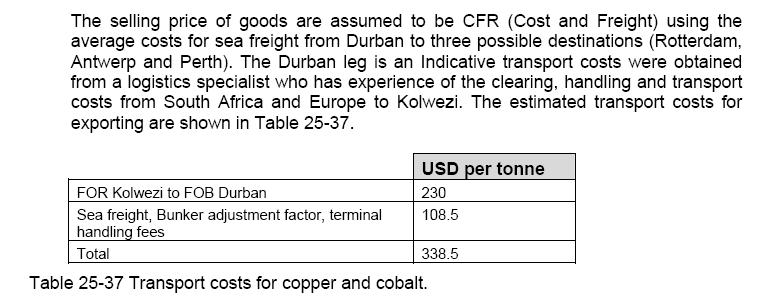 | transport cost from mine site to shipping at Durban RSA is estimated to be 338.5US$/tonne of metal | ||||